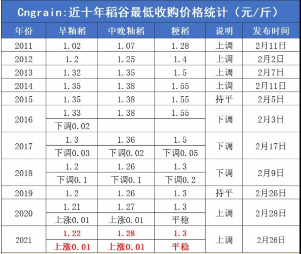 2021年國家繼續在稻谷主產區實行最低收購價政策。綜合考慮糧食生產成本、市場供求、國內外市場價格和產業發展等因素,經國務院批準,2021年生產的早秈稻(三等,下同)、中晚秈稻和粳稻最低收購價分別為每50公斤122元、128元和130元。根據近幾年稻谷最低收購價收購數量,限定2021年最低收購價稻谷收購總量為5000萬噸(秈稻2000萬噸、粳稻3000萬噸)。