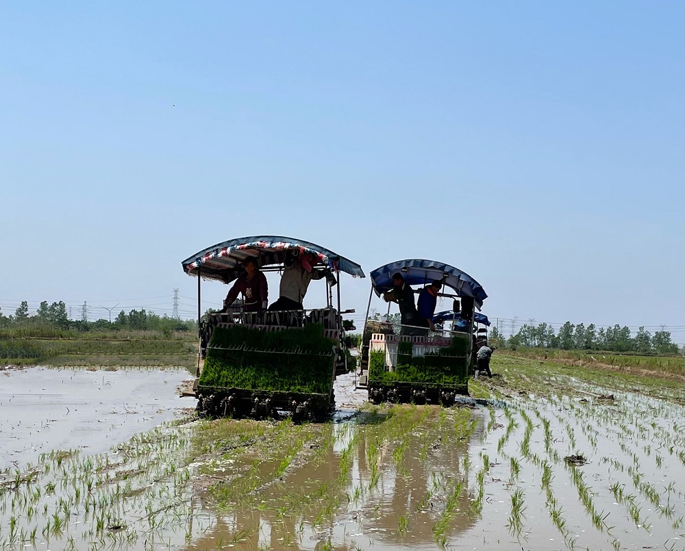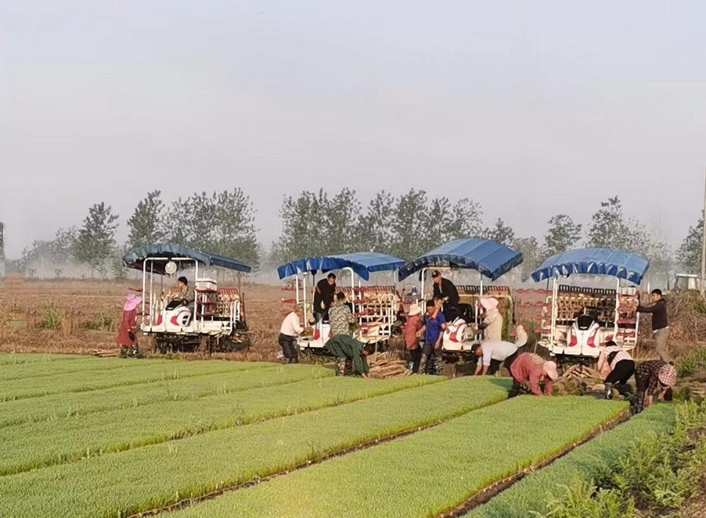 廣袤的農田里,一臺臺高速插秧機在秧田中來回穿梭,伴隨著轟隆隆的機器聲,一排排蔥綠的秧苗被整齊地排列在稻田中間,不一會兒的工夫,為水田就披上了一襲綠色的新裝,秧苗隨風搖曳,仿佛綠油油的翻騰的海洋。忙碌的人們,綠色的秧苗、穿梭田間的插秧機構成了插秧季里最美的一道風景。