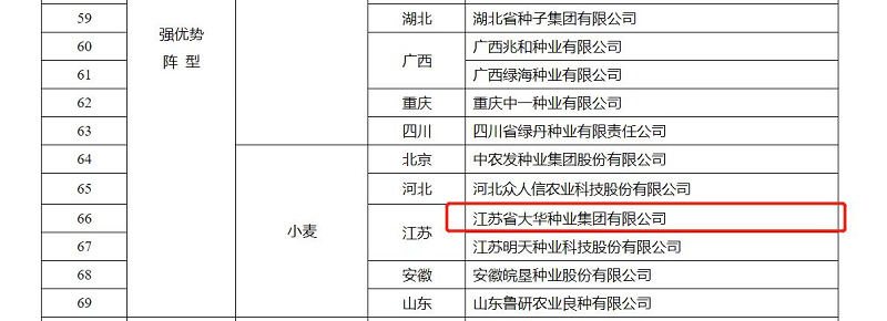 • 為貫徹黨中央、國(guó)務(wù)院種業(yè)振興決策部署,深入實(shí)施種業(yè)企業(yè)扶優(yōu)行動(dòng),近日農(nóng)業(yè)農(nóng)村部辦公廳印發(fā)《關(guān)于扶持國(guó)家種業(yè)陣型企業(yè)發(fā)展的通知》,根據(jù)企業(yè)規(guī)模、創(chuàng)新能力和發(fā)展?jié)摿Φ汝P(guān)鍵指標(biāo),從全國(guó)3萬余家種業(yè)企業(yè)中遴選了69家農(nóng)作物、86家畜禽、121家水產(chǎn)種業(yè)企業(yè)機(jī)構(gòu),集中力量構(gòu)建“破難題、補(bǔ)短板、強(qiáng)優(yōu)勢(shì)”國(guó)家種業(yè)企業(yè)陣型,加快打造種業(yè)振興骨干力量。江蘇省大華種業(yè)集團(tuán)有限公司入選“國(guó)家農(nóng)作物種業(yè)陣型企業(yè)·強(qiáng)優(yōu)勢(shì)陣型(小麥)”。