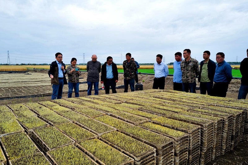 一行人首先參觀了復興圩分公司本部大隊的育秧流水線,現場聽取了當前水稻生產情況。復興圩分公司農業中心副主任宋金陽介紹:“今年,復興圩分公司采用疊盤暗化的育秧方式,主要優勢在于可以有效調控秧苗生長環境的溫濕度,更好地達到出苗整齊、秧苗健壯、成秧率高、抗逆性強等成效”。