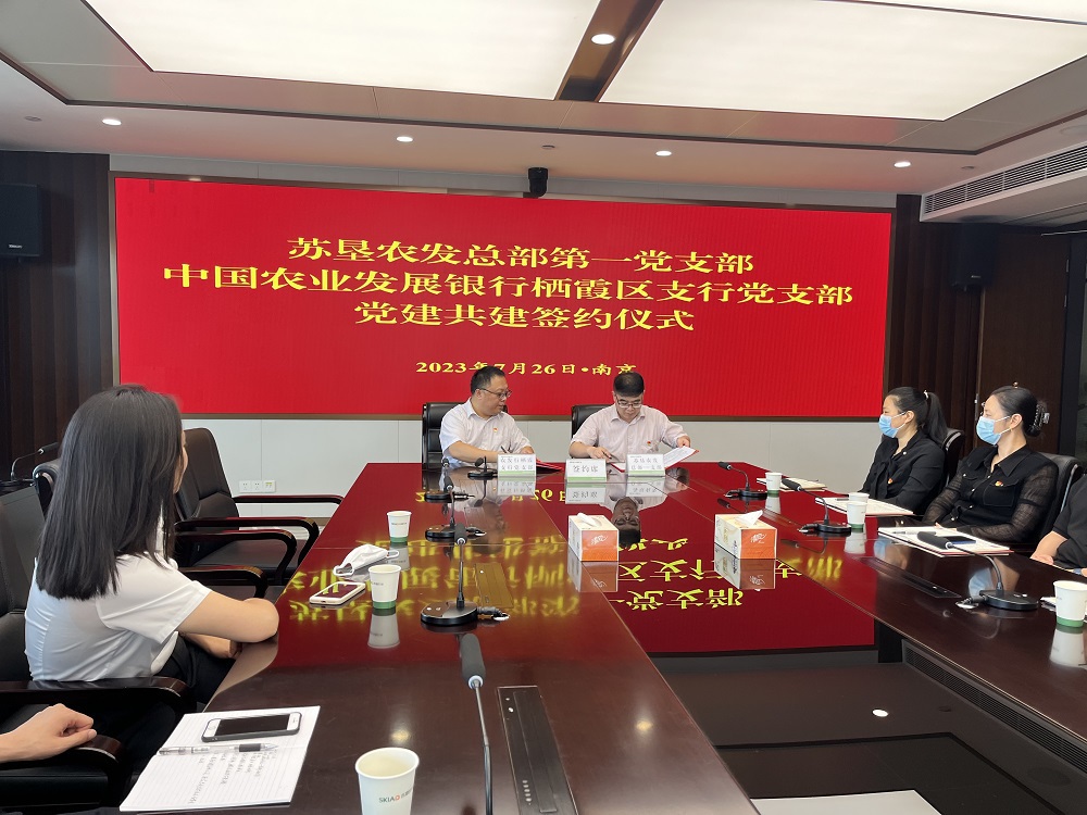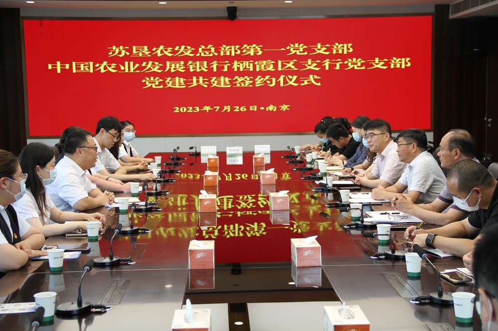 活動開始,雙方支部共同開展第一議題學習,蘇墾農發總部一支部書記劉剛領學了習近平總書記在江蘇考察期間發表的重要講話精神。農發行棲霞支行黨支部書記丁全楠領學了習近平總書記在《求是》雜志上發表的《健全全面從嚴治黨體系,推動新時代黨的建設、新的偉大工程向縱深發展》重要文章精神。蘇墾農發財務總監陶應美介紹了公司與金融機構業務開展情況,對公司深化與農發行在優化省級儲備糧業務、拓展農業政策性金融服務等方面合作提出建議。隨后,雙方支部緊扣“以學促干”開展了座談交流,就加強黨建工作及銀企業務合作作了深入探討等。雙方一致表示,蘇墾農發與農發行棲霞支行肩負保障國家糧食安全、落實“藏糧于地、藏糧于技”等國家重大戰略上有著共同使命責任,希望通過開展黨建共建,進一步推動黨建與業務融合,深化銀企合作。會上,雙方黨支部還簽訂了《黨建共建協議書》。