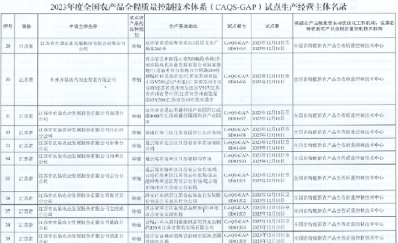 近日,農(nóng)業(yè)農(nóng)村部農(nóng)產(chǎn)品質(zhì)量安全中心公布2023年度全國農(nóng)產(chǎn)品全程質(zhì)量控制技術(shù)體系(CAQS-GAP)試點(diǎn)生產(chǎn)經(jīng)營主體名錄,蘇墾農(nóng)發(fā)旗下19家分公司和子公司蘇州蘇墾現(xiàn)代農(nóng)業(yè)發(fā)展有限公司均榜上有名。