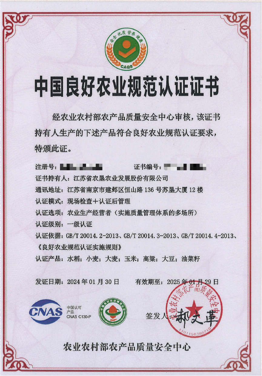 蘇墾農發獲全國單體最大規模良好農業規范(GAP)一級認證