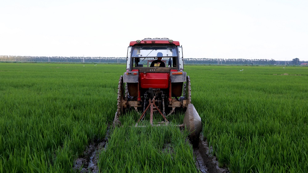 清晨五點,天剛蒙蒙亮,海南生產區43大隊水稻田里,工作人員已經開始忙碌起來。只見在碧綠茂盛的稻田中,農機駕駛員正進行水稻豐產溝壓溝作業,伴隨著機器陣陣轟鳴聲,不一會兒,一條條整齊筆直的豐產溝就赫然呈現在眼前。“建好水稻豐產溝是解決排水降澇、實現高產穩產的關鍵性生產措施,有了兩臺豐產溝壓溝機的助力,海南生產區4750畝水稻,5天就可以全部完成建溝工作,科技機械的加入,既解決了人工少、地塊多的問題,又能達到整齊度高、深淺一致的效果,為后期烤田管理、排水通暢打好基礎,真正實現一舉多得。”海南生產區技術員孫正說。