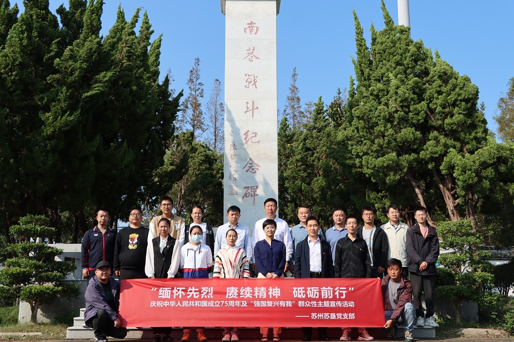 •        為慶祝中華人民共和國成立75周年,深入落實《新時代愛國主義教育實施綱要》,2024年10月8日蘇州蘇墾開展“緬懷先烈 賡續精神 砥礪前行”慶祝中華人民共和國成立75周年及“強國復興有我”群眾性主題宣傳活動,引導廣大黨員群眾“沉浸式”學習,傳承紅色,緬懷先烈、銘記歷史,不忘初心使命,汲取奮進力量。